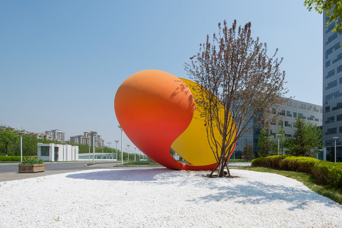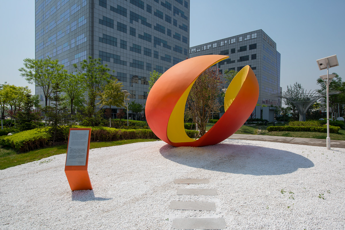 This installation adopts in its design the logo of SinoSingapore Tianjin EcoCity Investment and Development Co., Ltd (SSTEC), which is a seed that holds the promise of a new beginning. Seed leaves encapsulate the seedling – a crabapple tree – offering it nutrients and protection. The crabapple tree emerges from the seed leaves, reflecting growth and the natural progression of life, and symbolizes the growth and transformation of the Eco-City from a saline wasteland into a vibrant city, under the support and care of China and Singapore.