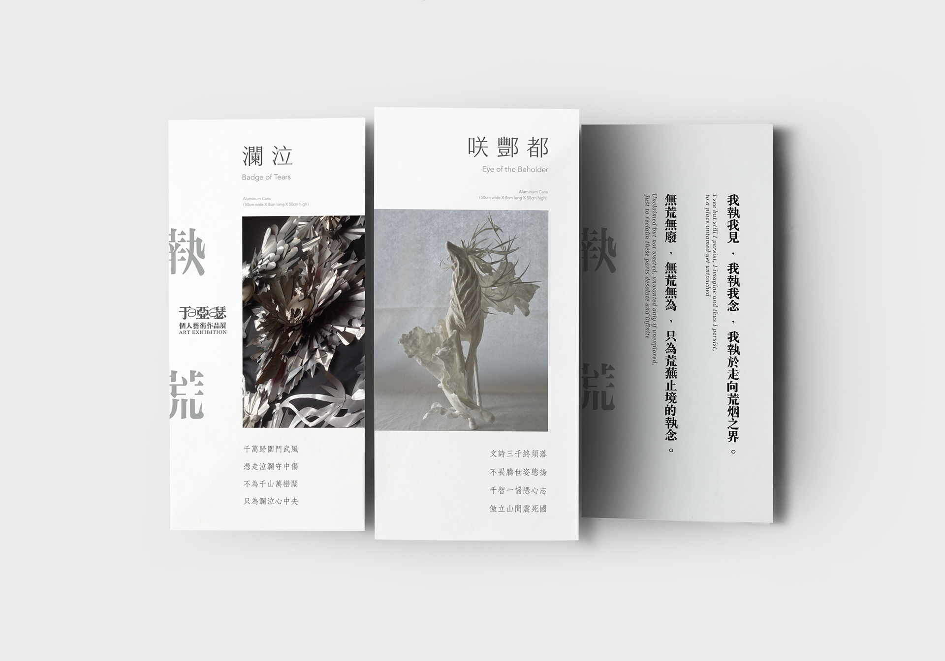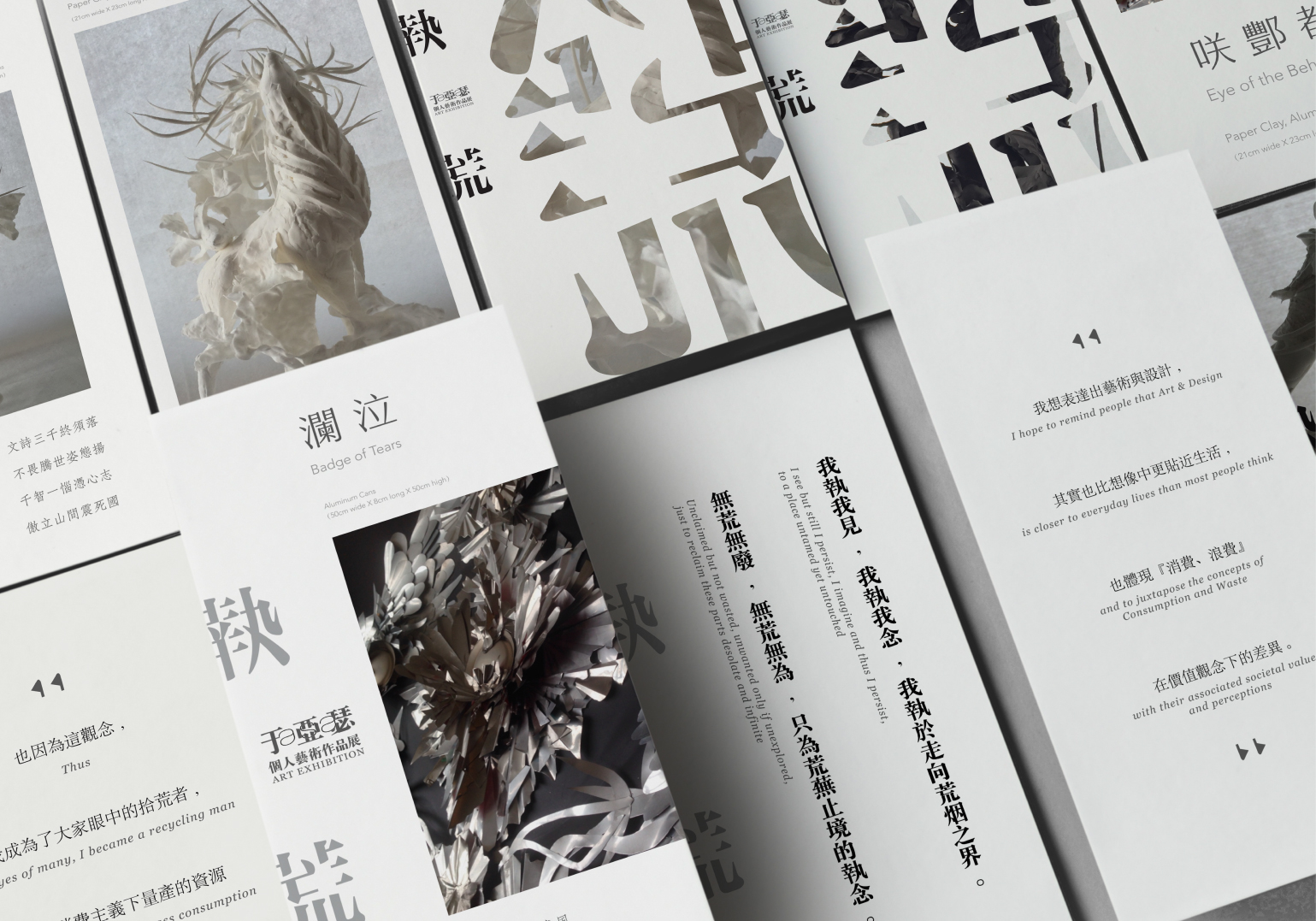 Asa Yu is an up and coming Taiwanese artist who create sculptures with recycled materials like aluminium cans, beer bottles, bottle caps, and paper clay. We created the branding identity for his debut show in Beijing China. The visual materials will extend to his future exhibitions in Shanghai and Shenzhen.