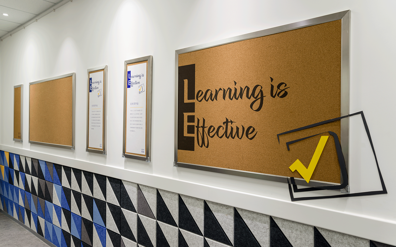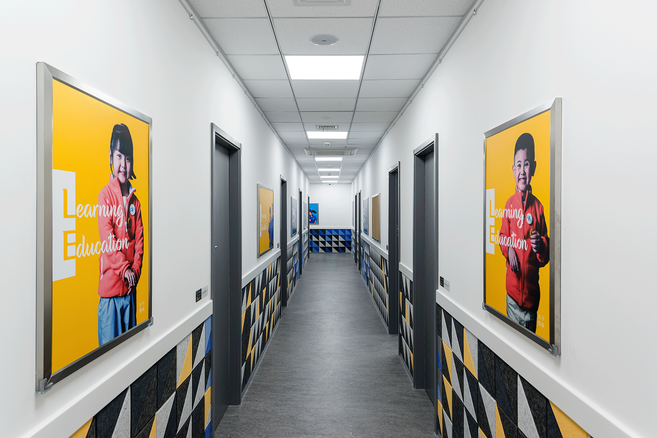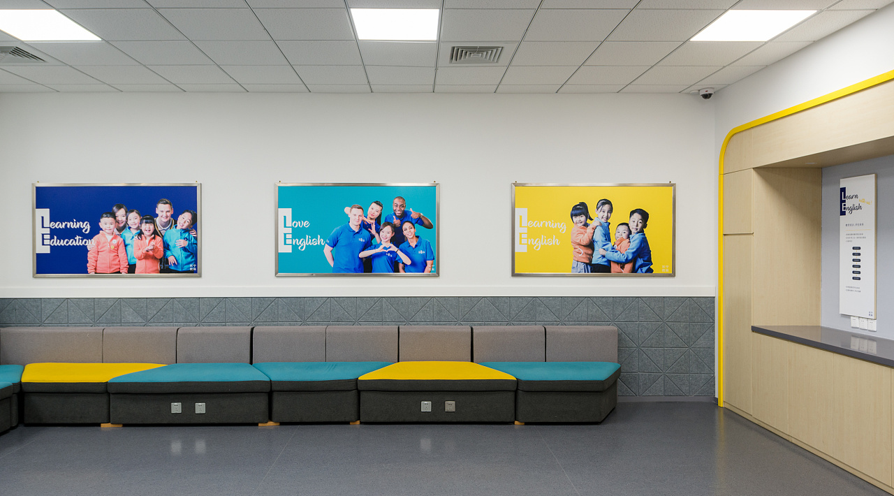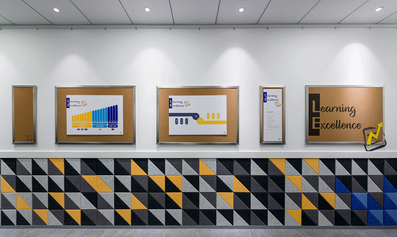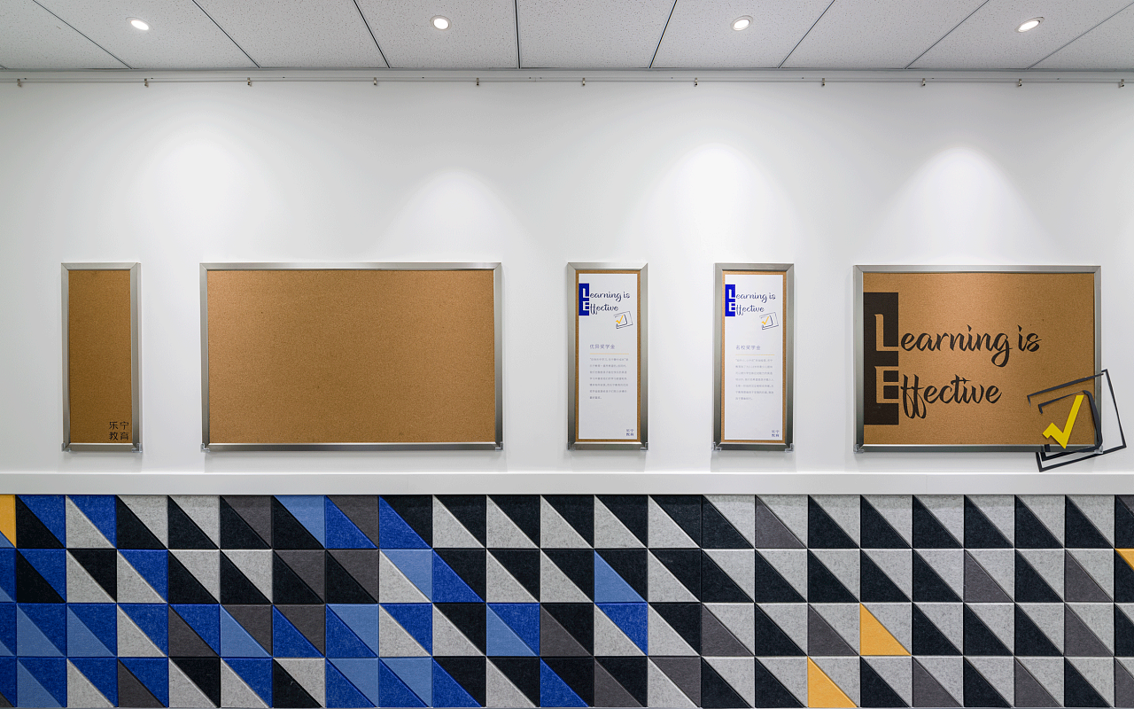 The aisle in the teaching area was originally long and narrow, and the sound-absorbing panel module can help reduce bumps and reduce mutual interference between the outside world and the teaching environment. We have made visual and functional planning for this. Above the waistline is mainly for visitors and parents. This part presents the advertisement pictures of teachers and students, arranged according to the rules of characters (corresponding to the exclusive color); below the waistline is from the perspective of children, creating a colorful sensory environment.