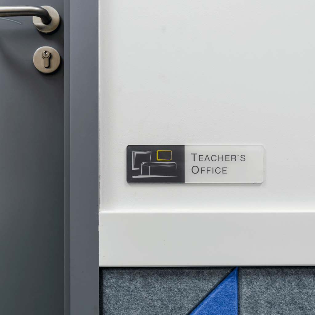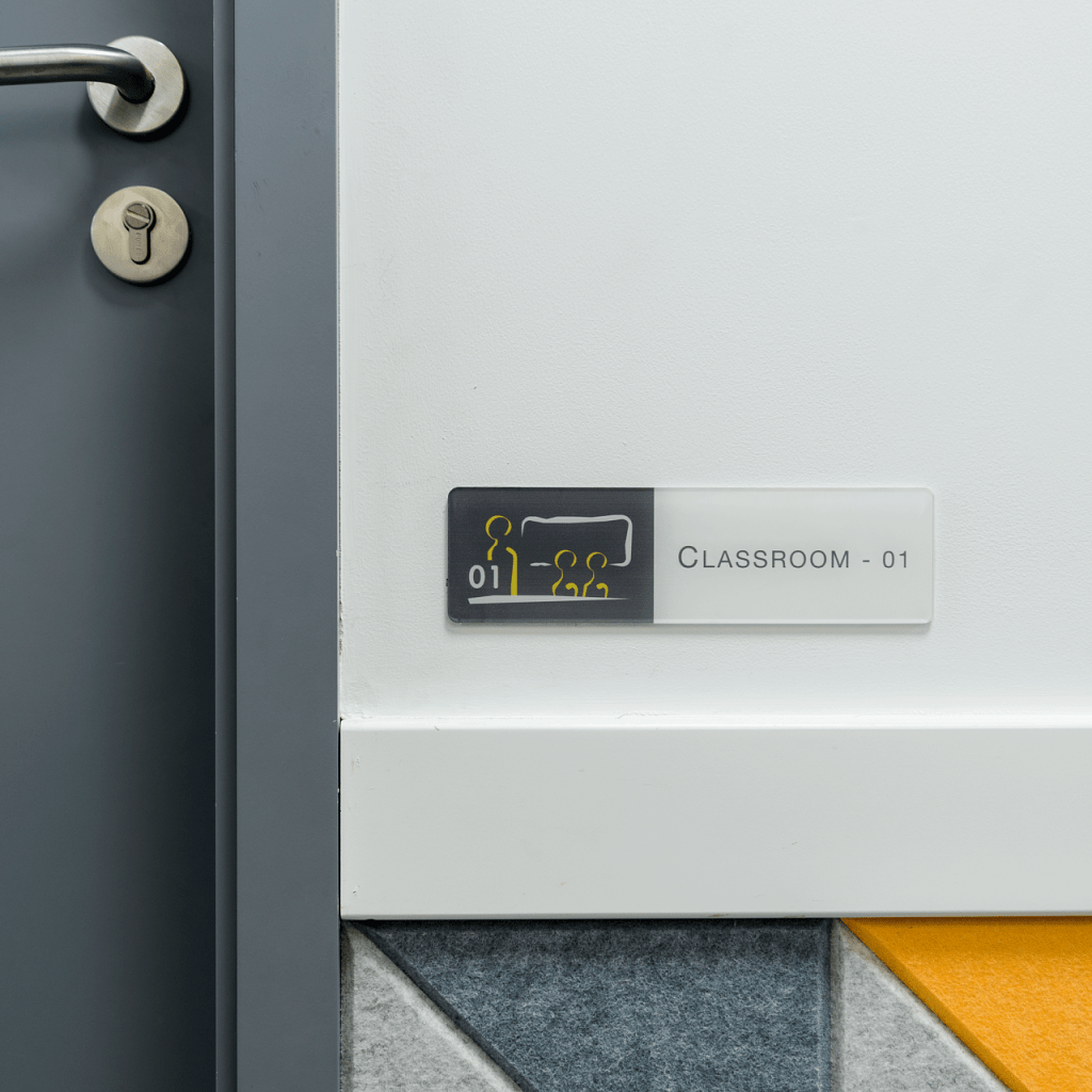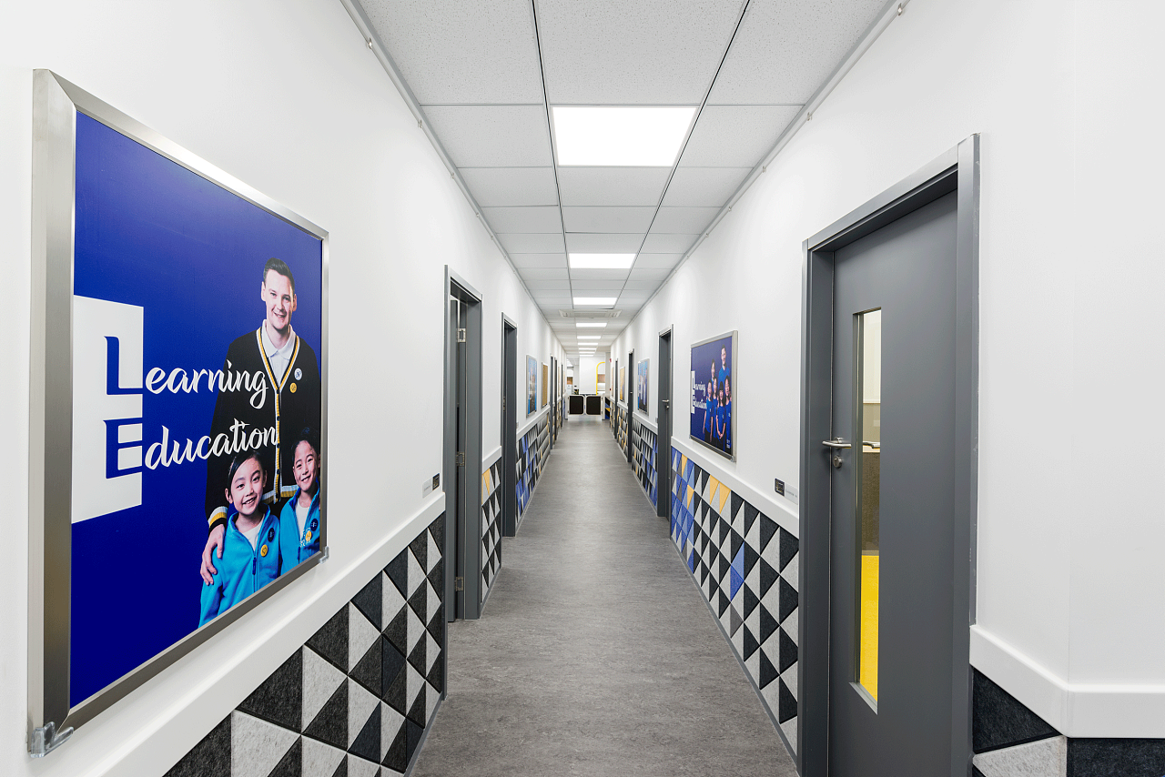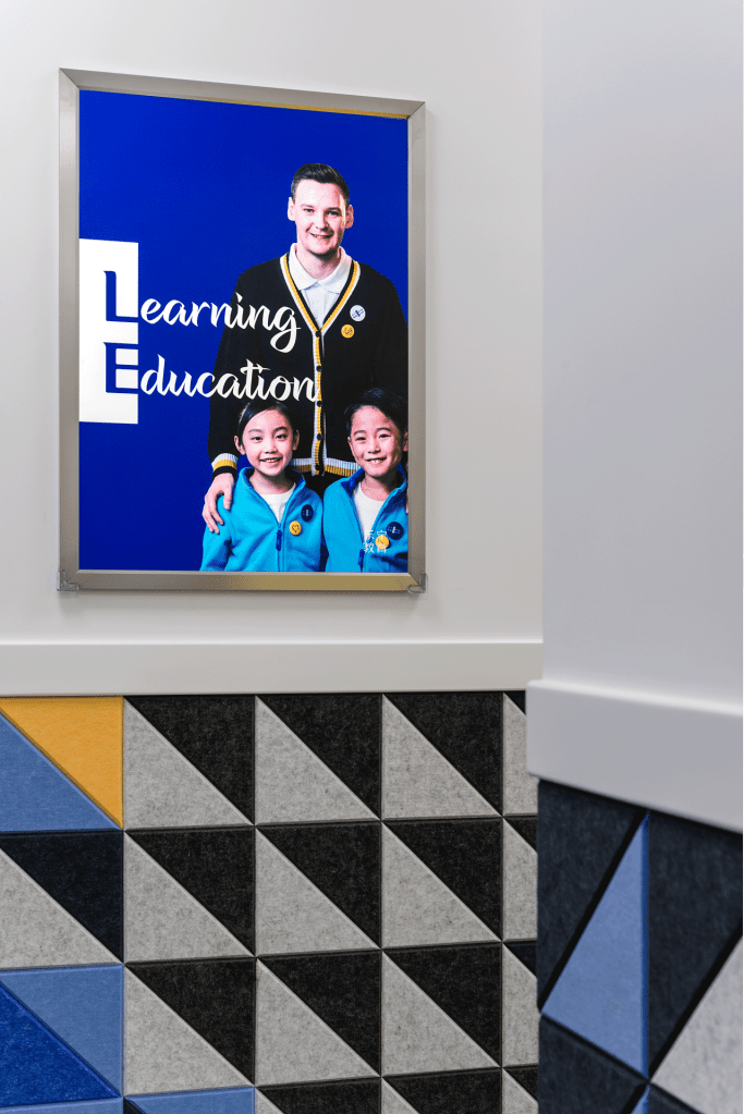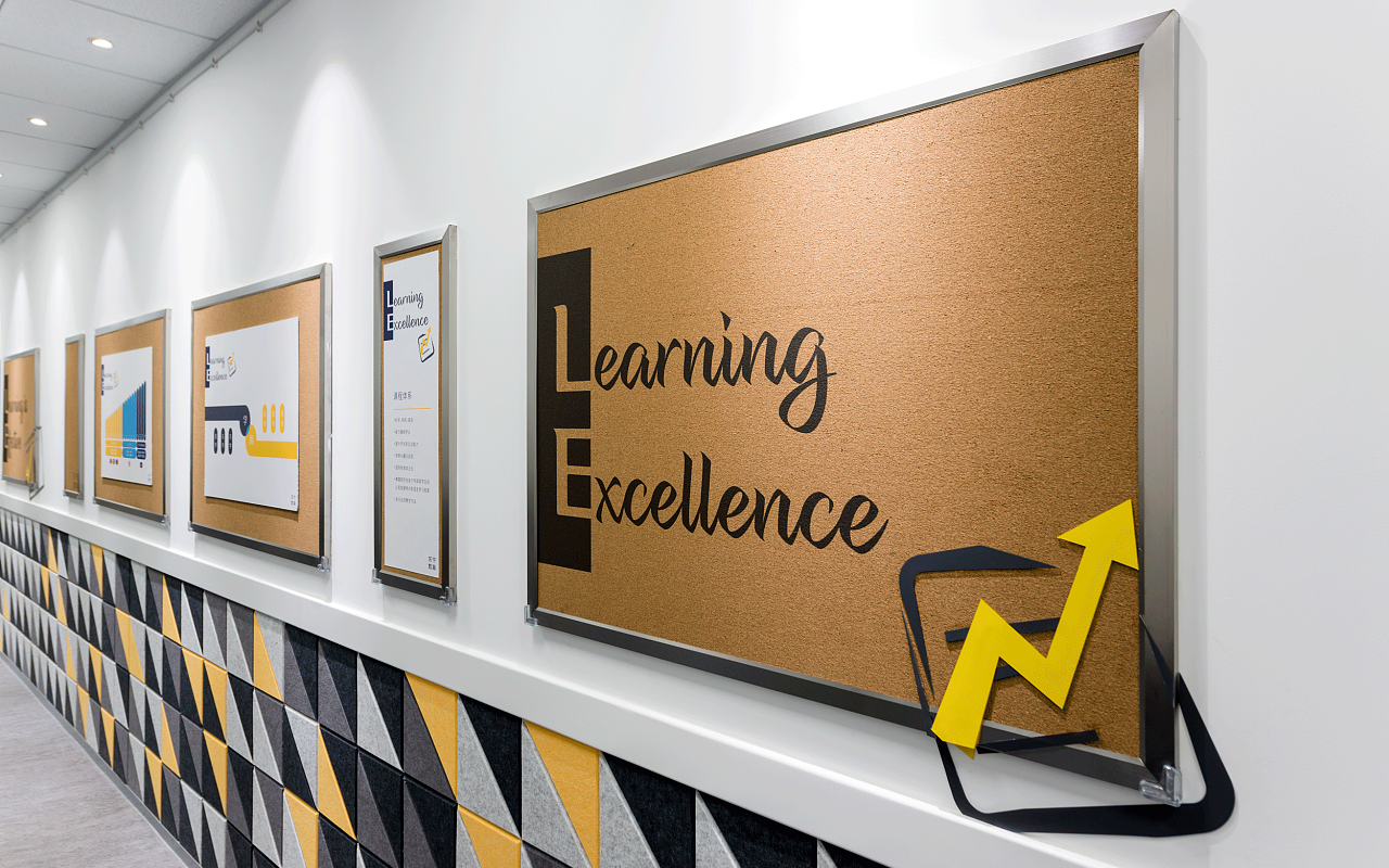 The aisle in the teaching area was originally long and narrow, and the sound-absorbing panel module can help reduce bumps and reduce mutual interference between the outside world and the teaching environment. We have made visual and functional planning for this. Above the waistline is mainly for visitors and parents. This part presents the advertisement pictures of teachers and students, arranged according to the rules of characters (corresponding to the exclusive color); below the waistline is from the perspective of children, creating a colorful sensory environment.