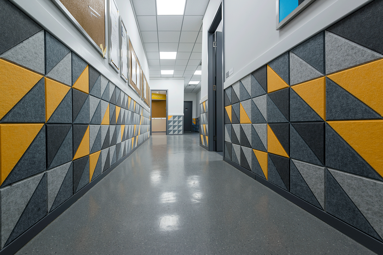 These sound-absorbing panels use right-angled isosceles triangles as a module and are collaged on site. On the whole, it is arranged in a mosaic gradient with the law of grey-blue-gray. Gray is the basic color, and the color corresponds to the background color of the poster picture above, and the distribution is jumpy; at the corner of the wall, we increase the proportion of dark blue, which forms a clear difference with the gray walls on both sides, so as to prevent children from moving quickly. The judgment of spatial structure appears wrong. We use these arrangement methods and color rhythms to keep the long corridors childlike and smooth, encouraging and caring for children to learn, play and grow from multiple dimensions.