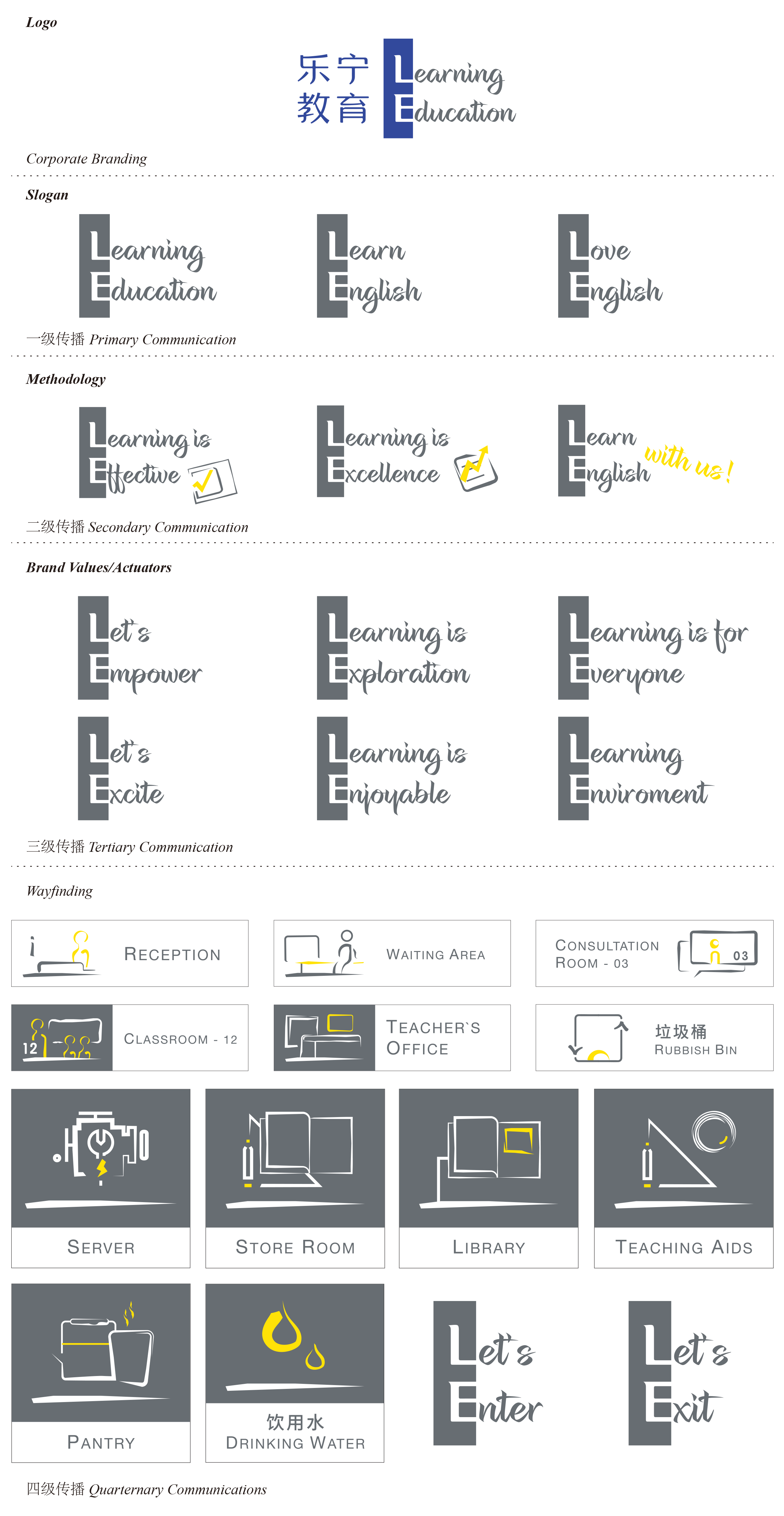 At the beginning of the project, we conducted in-depth interviews with the founders and core teams, and visited several representative teaching centers. We have found that in addition to the professionalism and rigor of the education industry, Lening is characterized by sincerity, inclusiveness, attentiveness, and diversity. Through deeper exploration, we have found a visual presentation that conforms to the core of the spirit of Le’ning, which is clean, direct, inclusive, and diverse. As an element of the logo, “LE” is drawing infinite combinations of possibilities.