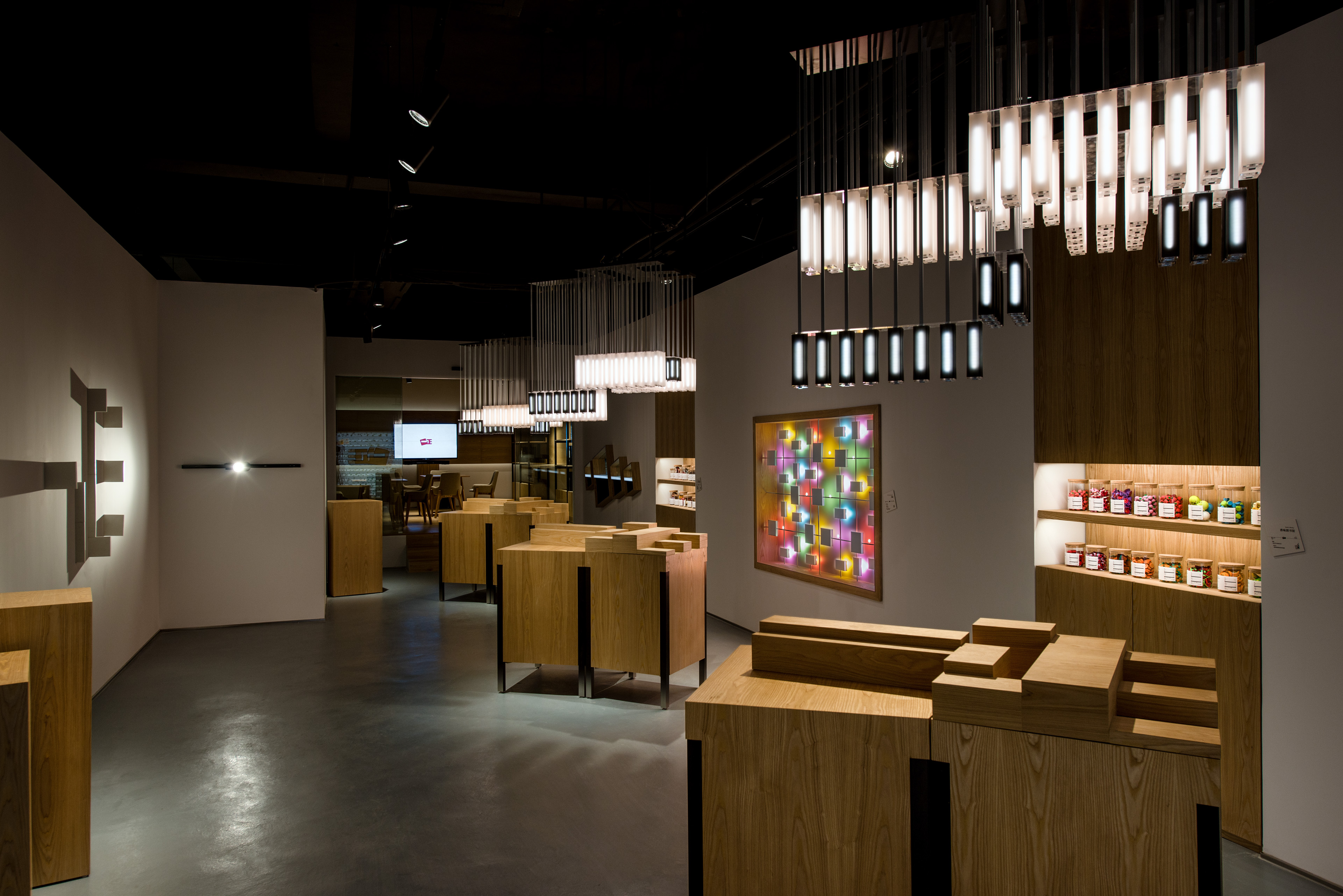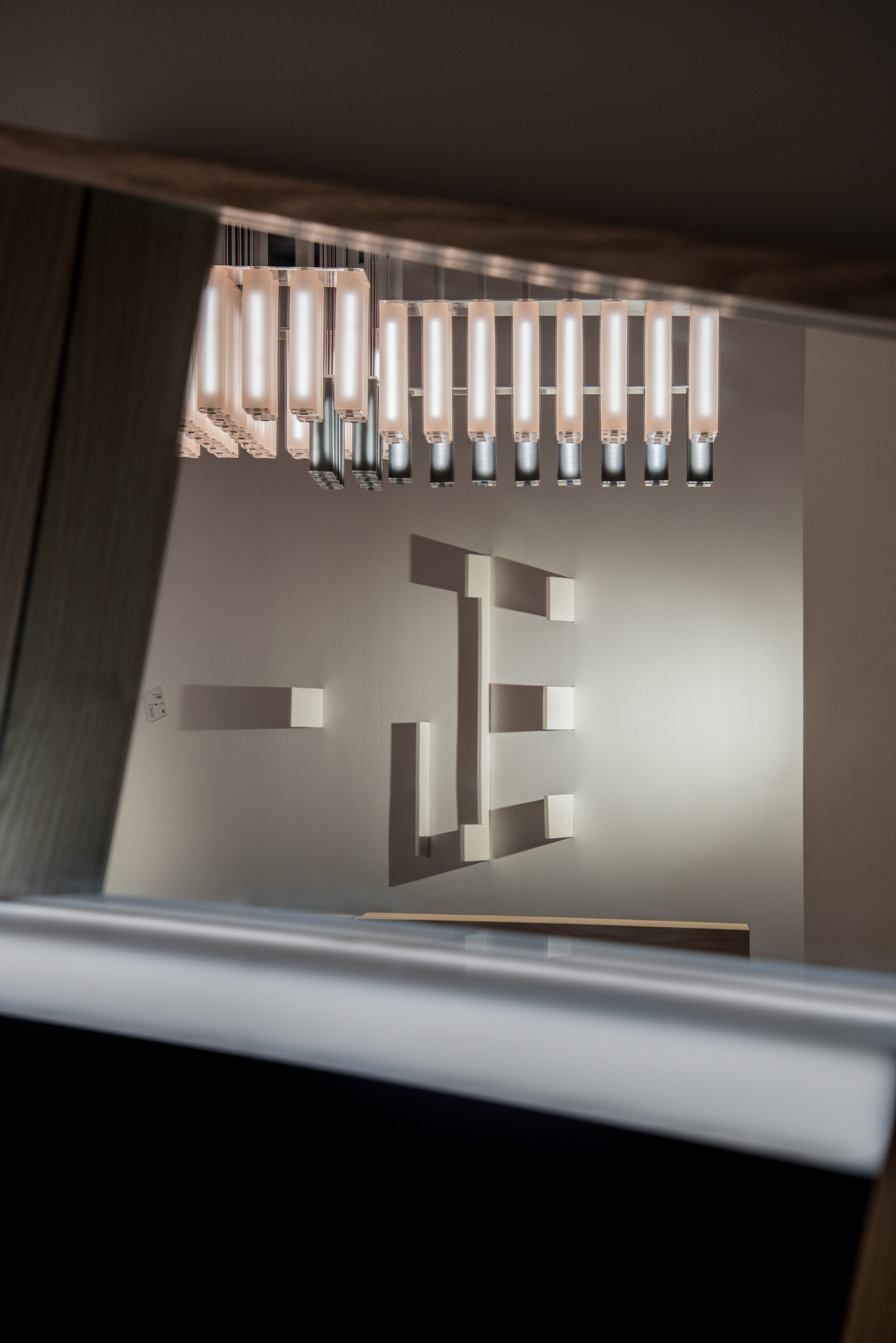 Besides the light play, we wanted to make something surprising for which rubber is suited for yet seldom considered. We experimented with making rubber light fixtures, and after numerous prototyping rounds, they turned out amazingly well. It took a while to get the right mix of both rigidity and translucency in the white and black rubber tubes. We made 3 sets of these rubber chandeliers, and they are configured differently elevation wise. But from a bottom looking up, it spells the chinese characters of Yizheng, being a mirror image of the wooden blocks on the podium below.