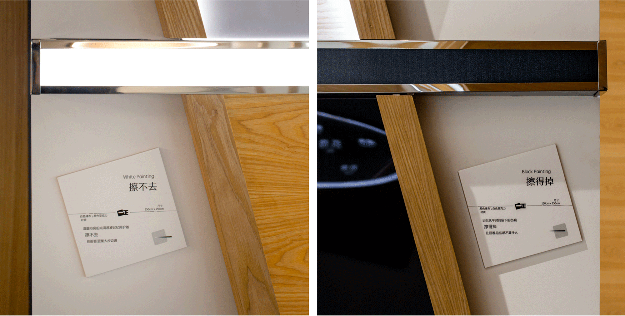 Spatially, the tunnel is not only a transitional space. The 5 key posters are placed along the tunnel walls at a 15 degree angle (consistent with the incline in the logo). A line that shifts from black to shining white cuts the posters in half, emphasizing the two sides of the same story. This line is the spatial embodiment of the idea of what is erased away and what is not. Turning the corner the line ends at opposite sides of the tunnel, cutting across a black painting and a white painting. Looking forward and backward in the tunnel is like looking into the future and back at the past. With the right encouragement, we walk towards the white painting, and see the growth we have attained, only to turn back to realise we have overcome these obstacles that are on the black painting.