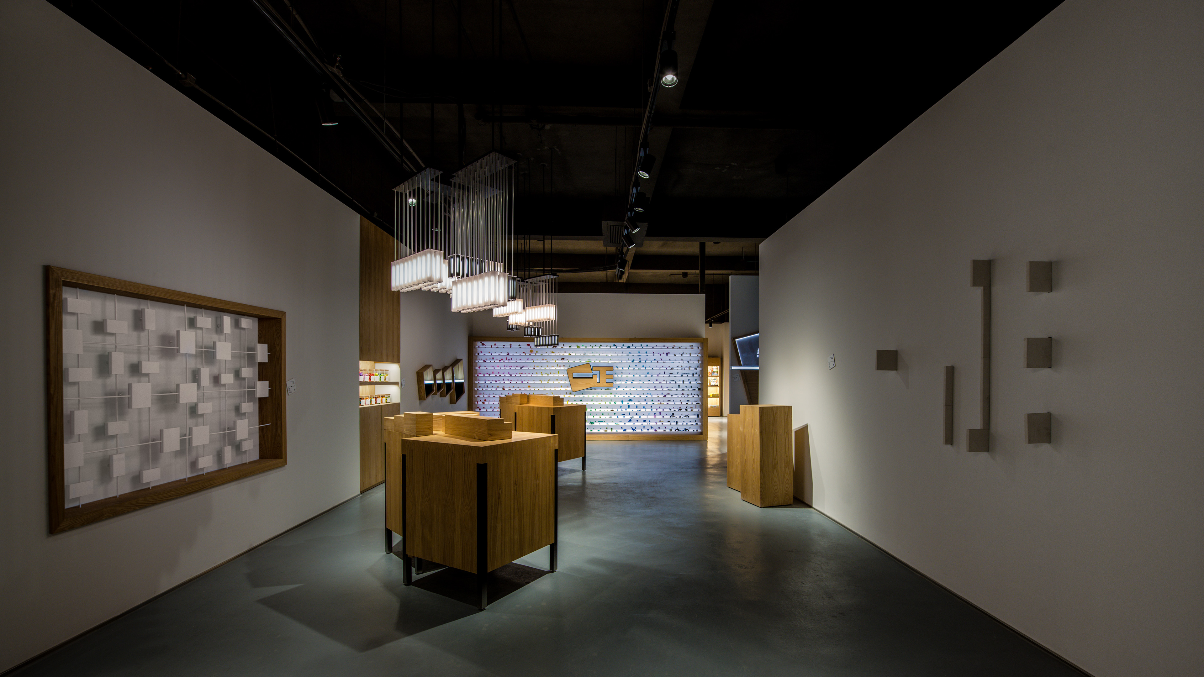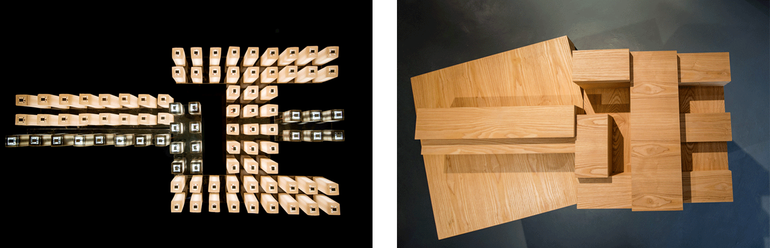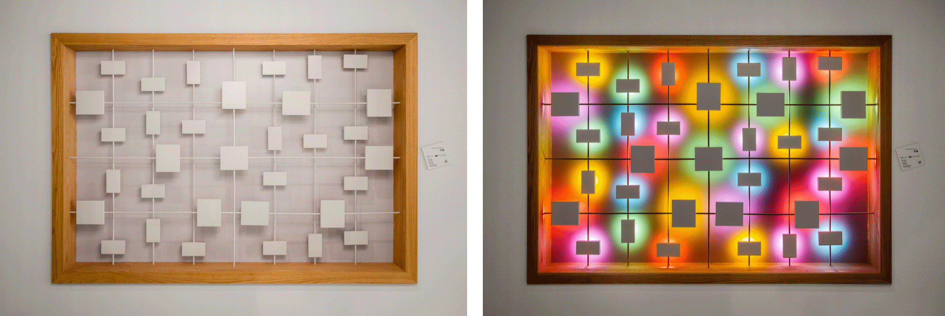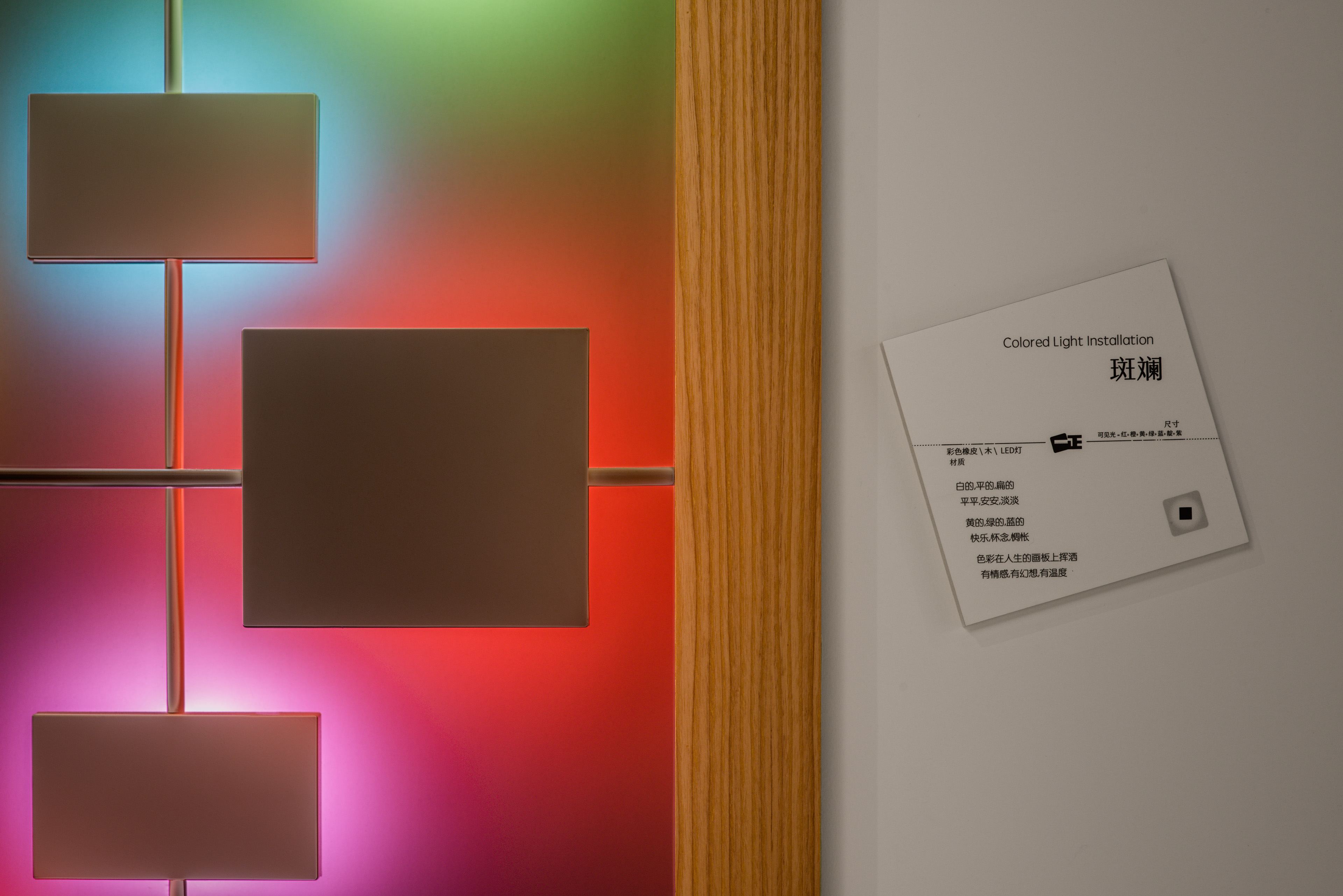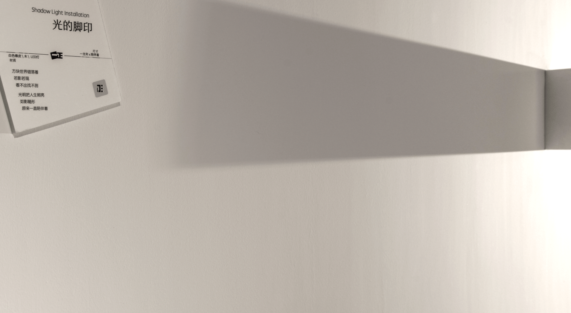 We installed two rubber light installations. One is a play on shadow, another on colour. White rubber blocks protrude from the wall in seemingly random fashion, only when the light is turned on do the Yizheng chinese characters come into being. In the second we used light reflected off coloured rubber blocks to compose a painting with light. Both are dramatized by the before after effect in the storytelling with light.