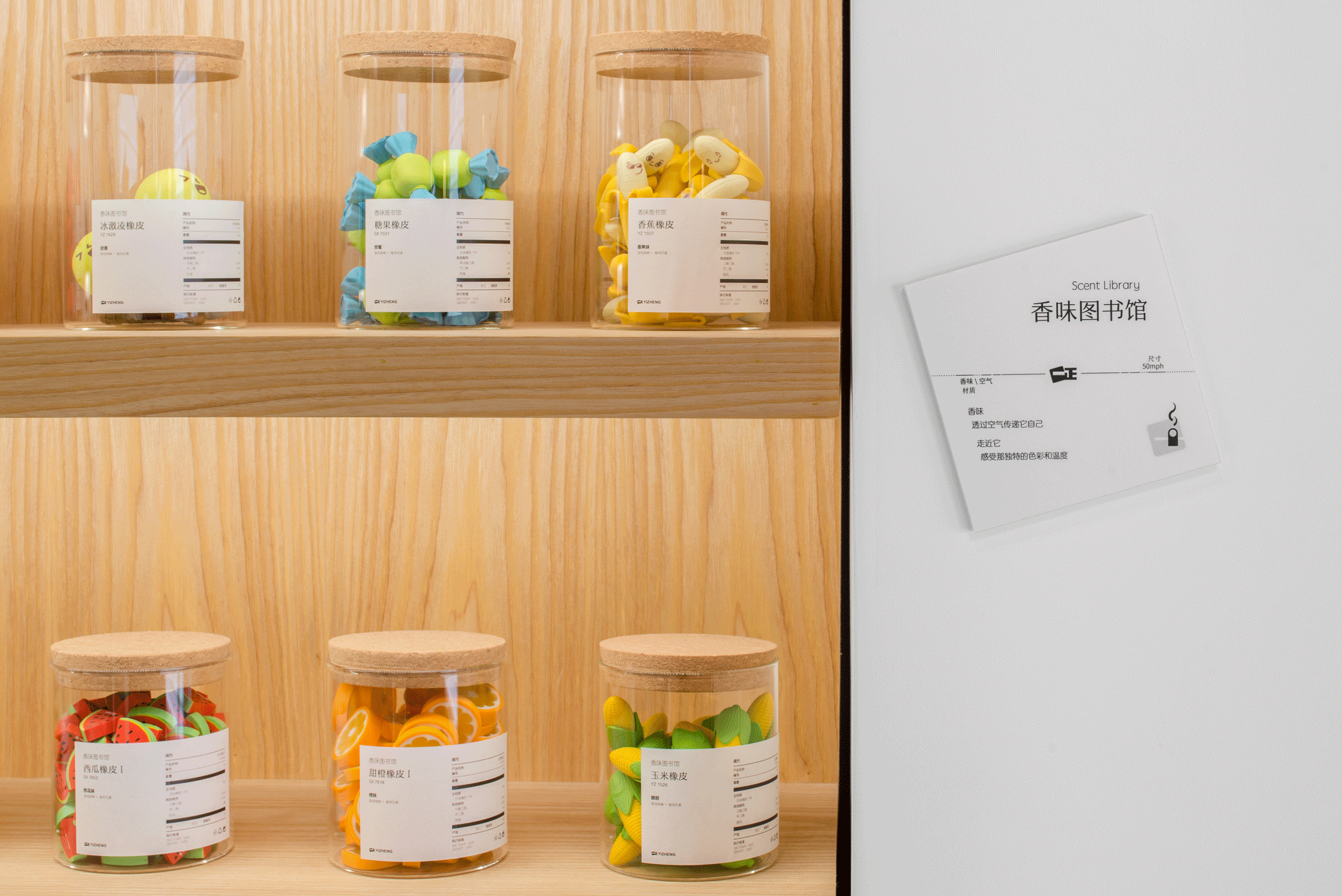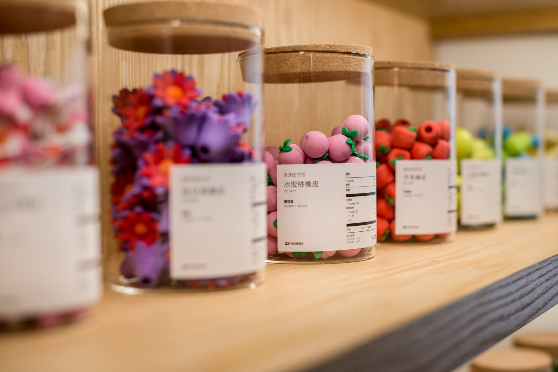 Here, we want to showcase the fact that Yizheng products uses food quality colouring and scent additives. Safety is especially important to parents. We placed the erasers in jars, and for the guests to open them and smell. This adds a level of interactivity without the message being too in your face.