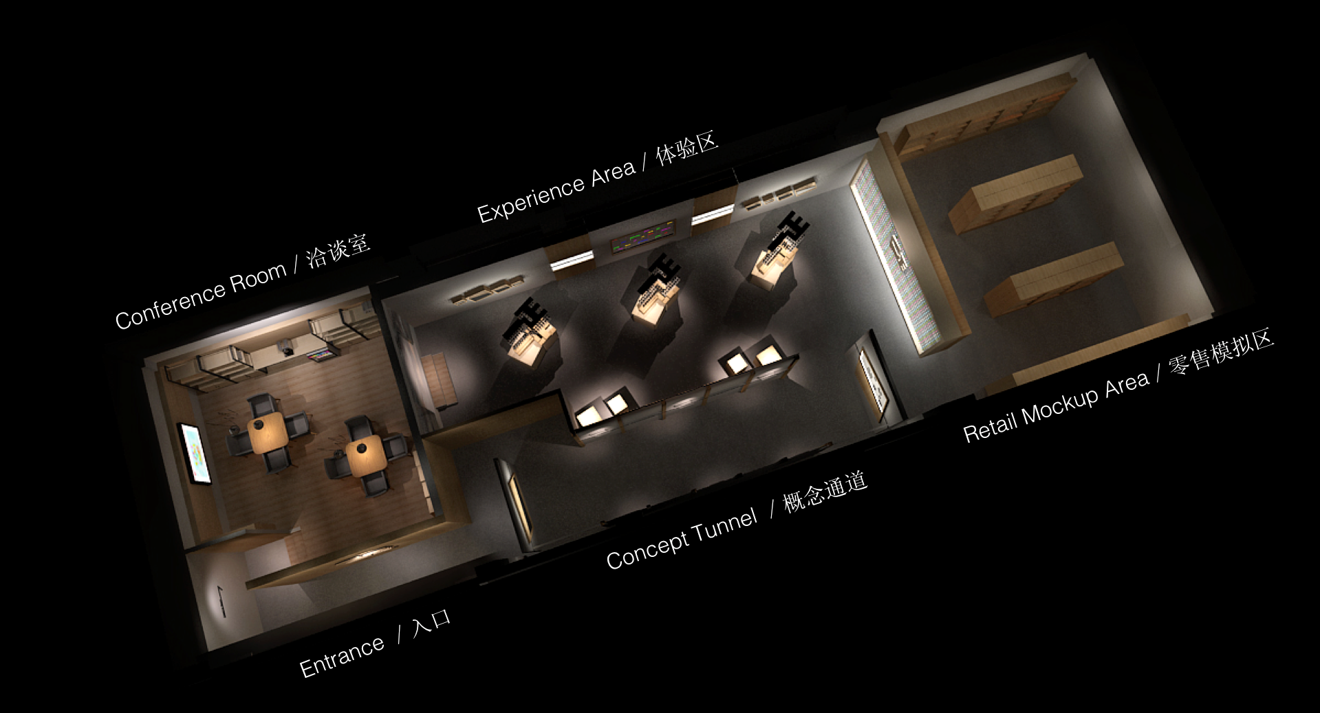 This experience centre is situated in the factory, it is meant to be part of an entire sales journey. As such, the spatial layout and circulation is meant to enhance this experiential journey. Upon arrival, they past through the lobby, enter the experience centre and turn left into conference area. Here they rest, freshen up take a drink, and watch the brand video. Thereafter, they leave to visit the factory, to see for themselves the level of automation and production sophistication. Re-entering the space, they turn right, passing into the concept tunnel, and into the retail mockup area. It is important for business partners to understand the diversity of their product range. The journey continues into the experience zone and back to the conference room where the client will address further questions and conclude the business discussion.